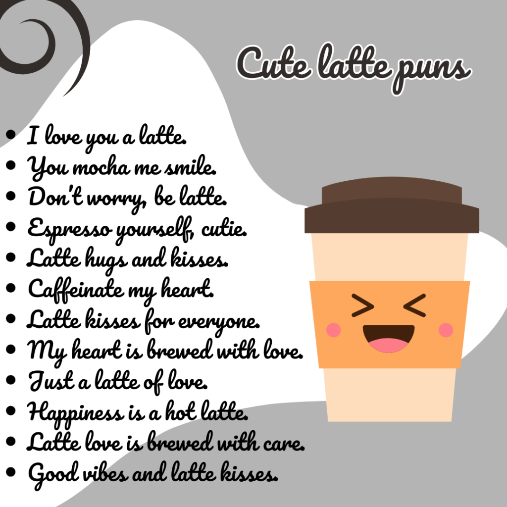 Cute latte puns include phrases like “Latte love is a beautiful thing” and “Caffeine and cuddles make everything better.” These light-hearted and adorable puns are perfect for sharing with friends or loved ones.